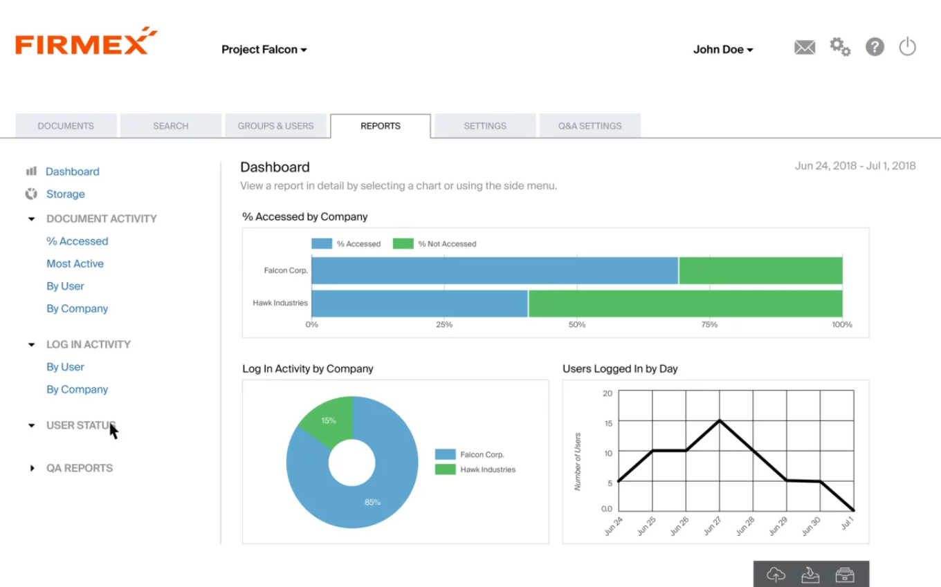 - Informes de sala de datos informativos. Firmex genera informes de actividad detallados hasta el nivel de documento. Puede ver quién hizo qué en sus salas de datos, proyectos, carpetas y documentos individuales por día, semana, mes y año.