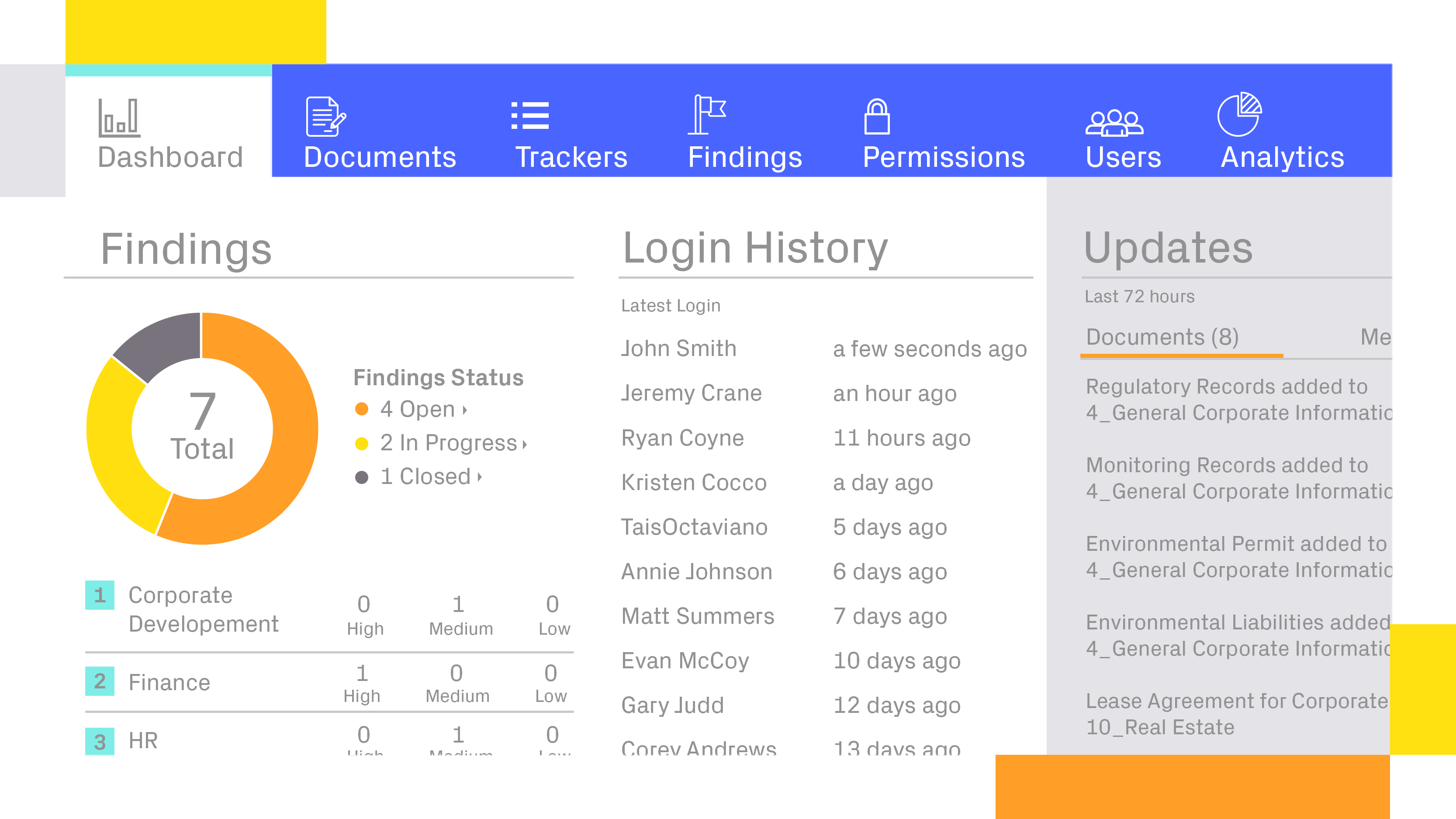 Analíticas sofisticadas. El data room genera informes de análisis visual que categorizan la participación por documento, carpeta y proyecto. Puede verificar la actividad del usuario, el historial de inicio de sesión, el historial de versiones de archivos, estadísticas de participación por fecha, dirección comercial, etc. El sistema actualiza los datos cada 15 minutos. Además, puede programar informes y exportarlos en múltiples formatos, incluyendo CSV y XLSX.