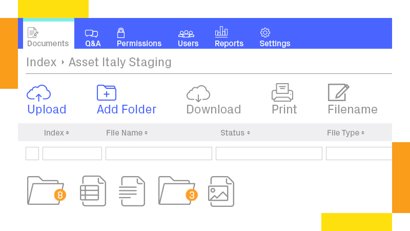 Categorización y indexación impulsada por IA. DataSite AI le ayudará a asignar archivos y construir un índice de sala de datos. No hay necesidad de agregar categorías de archivos manualmente, todo lo que necesita hacer es confirmar las sugeridas.
